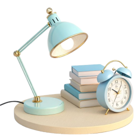 Desk lamp books and alarm clock on a wooden surface